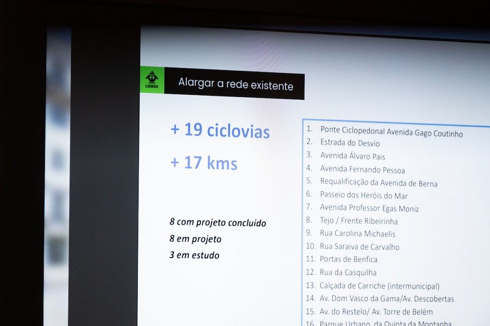 O alargamento de rede, explicou, passa por mais 19 ciclovias e mais 17 km, oito das quais com projeto concluído, oito em projeto e três em estudo: Ponte ciclo pedonal Avenida Gago Coutinho | Estrada do Desvio | Avenida Álvaro Pais | Avenida Fernando Pessoa | requalificação da Avenida de Berna | Passeio dos Heróis do Mar | Avenida Professor Egas Moniz | Tejo/Frente Ribeirinha | Rua Carolina Michaelis | Rua Saraiva de Carvalho | Portas de Benfica | Rua da Casquilha | Calçada de Carriche (intermunicipal) | Avenida Dom Vasco da Gama/Avenida Descobertas | Avenida do Restelo/Avenida Torre de Belém | Parque Urbano da Quinta da Montanha | requalificação da Praça Marechal Humberto Delgado | Restauradores/Rua da Prata | requalificação da Parada do Alto de São João.